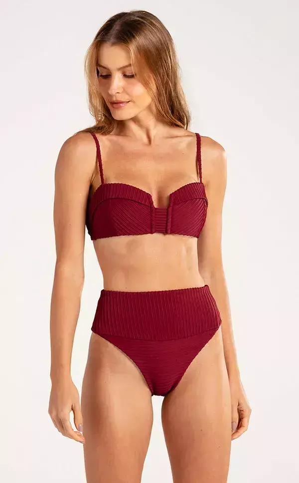 Top estruturado confeccionado em tecido texturizado estilo corselet. Possui alças ajustáveis e espuma fixa.
