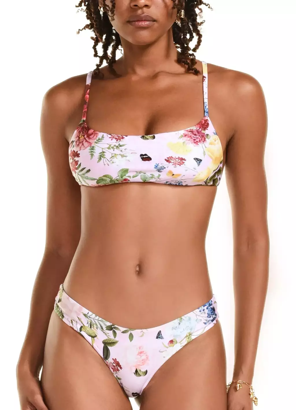 Biquíni com proteção UV 50+ microfibra estampa digital floral exclusiva Verão 2026. Top de alça fina ajustável por regulador e laço removível no busto, garantindo versatilidade e charme. A calcinha modelo asa delta dupla oferece caimento impecável sem marcar, valorizando e alonga a silhueta com conforto.